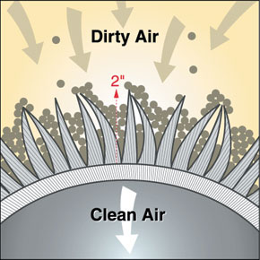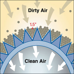 | 短而硬的創新濾材褶裥,大大提高了粉塵捕捉和清灰效率。通過減短濾筒的褶高:從標準的50mm (2英寸) 縮短至38mm (1.5英寸),使褶壁不易折疊或彎曲,令攔截下來的粉塵更易被清出。 |
