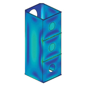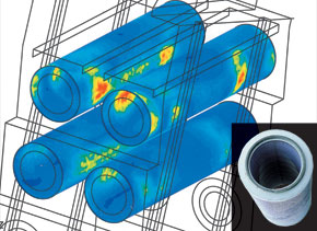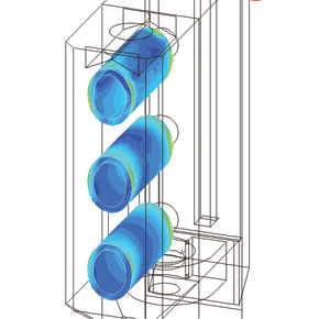 先進的FLUENT軟件模擬流體動力學,結構力學和聲學分別模擬了DFO型號1-1,2-2,3-3的性能等級。而下面(左圖)顯示了利用FLUENT軟件作流量測試,從而令DFO 3-3內部的氣流速度更均勻分布。另外下右圖顯示了利用ANSYS®*結構分析軟件測試DFO 3-3,在正常工作壓下之內部壓力分布測試。